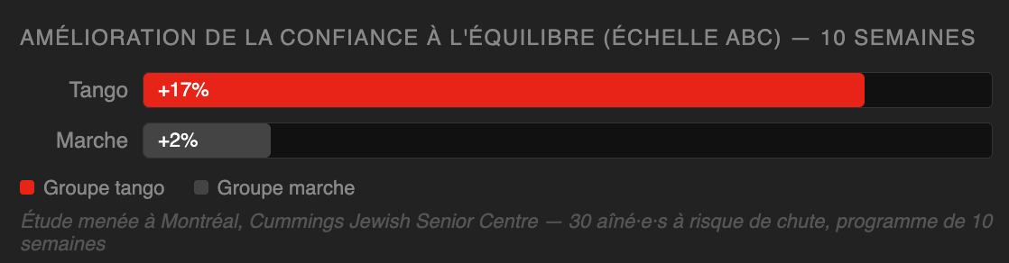 Les mouvements du tango — transferts de poids, pas multidirectionnels, pivots — ciblent précisément les compétences liées à l'équilibre fonctionnel. Les chercheurs de McGill ont mesuré une amélioration significative après 10 semaines.