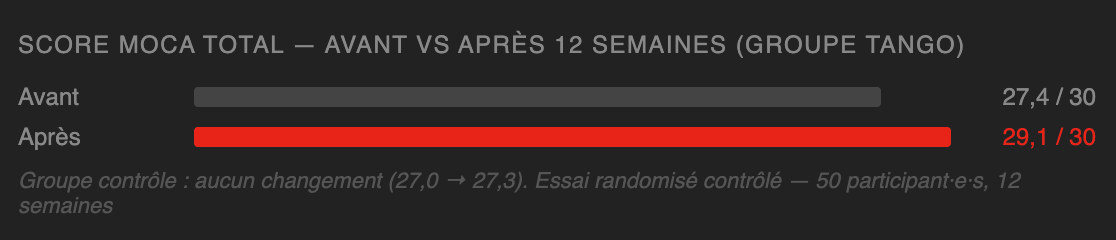 Écouter la musique, anticiper le partenaire, naviguer dans l'espace — le tango engage plusieurs fonctions cognitives simultanément, avec des gains mesurés en mémoire de travail et en flexibilité cognitive.